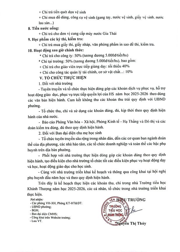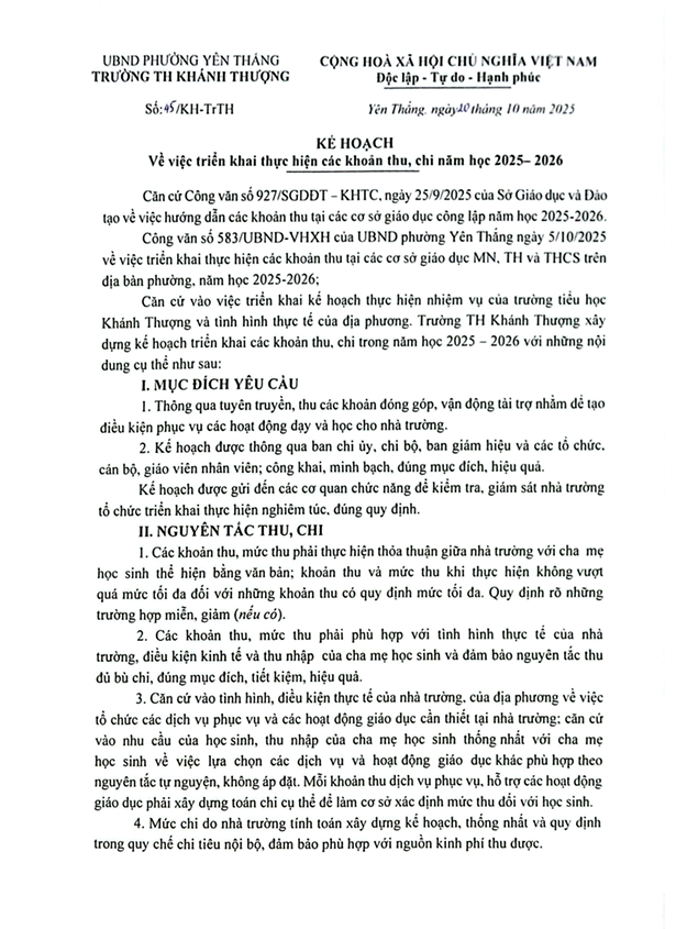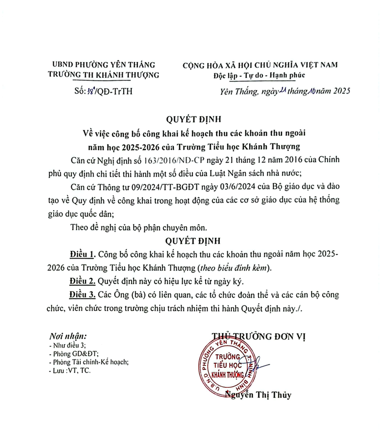 Trường Tiểu học Khánh Thượng phường Yên Thắng quyết định “Về việc công bố công khai kế hoạch thu các khoản thu ngoài năm học 2025-2026 của trường Tiểu học Khánh Thượng “