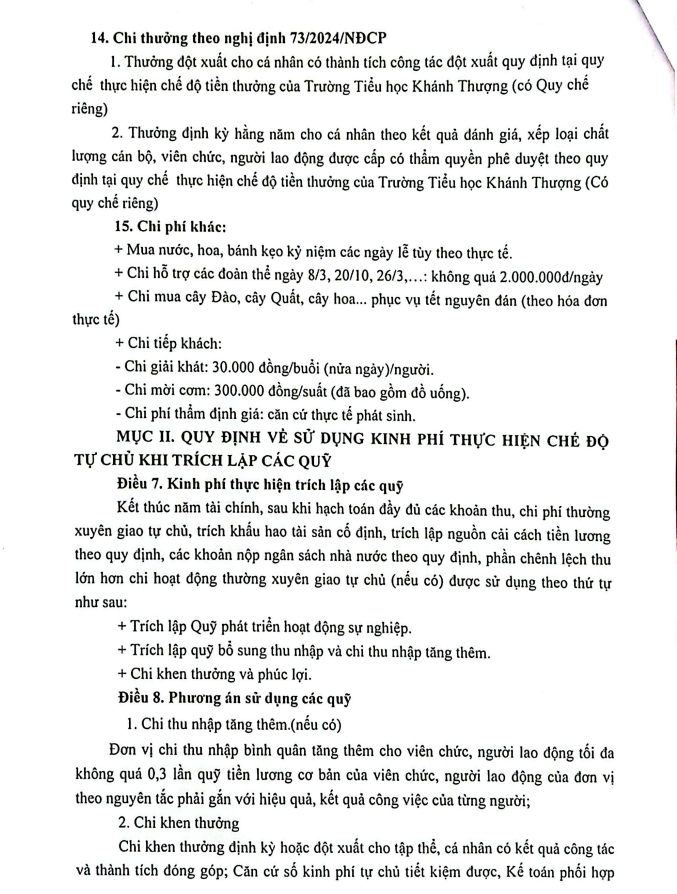 Quyết định Ban hành Quy chế thực hiện chế độ tiền thưởng theo Nghị định số 73/2024/NĐ-CP của trường Tiểu học Khánh Thượng
